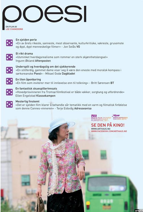 Vindtornfestivalen presenterer et sørkoreansk mesterverk og en prisvinnende film. POESI er en hyllest til litteraturen, og den graver dypt i menneskesinnet.